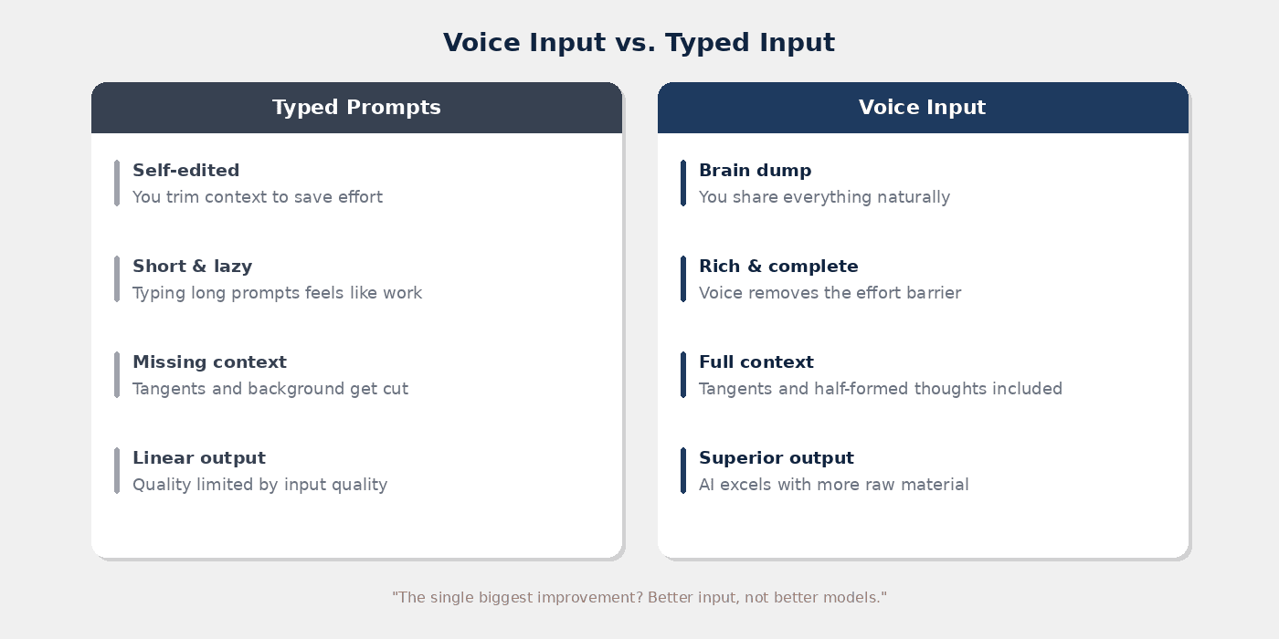 | AI Input | Typed prompts, carefully edited | Voice brain dumps, raw and complete |