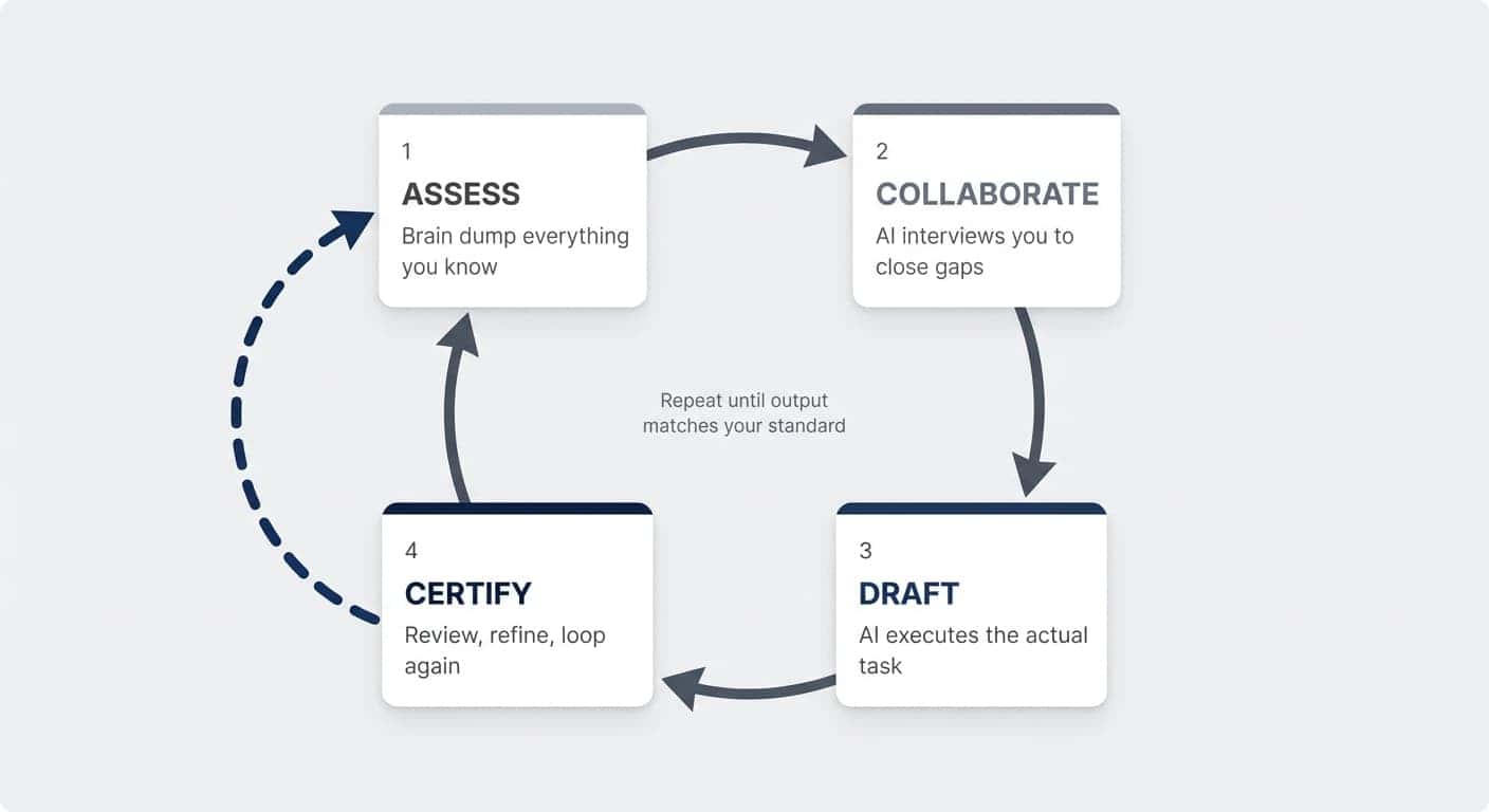 | Certify | Review output, identify gaps, feed corrections back into Assess → loop again | Output matches what you would produce yourself | Stopping after one loop — the first draft is never the last |