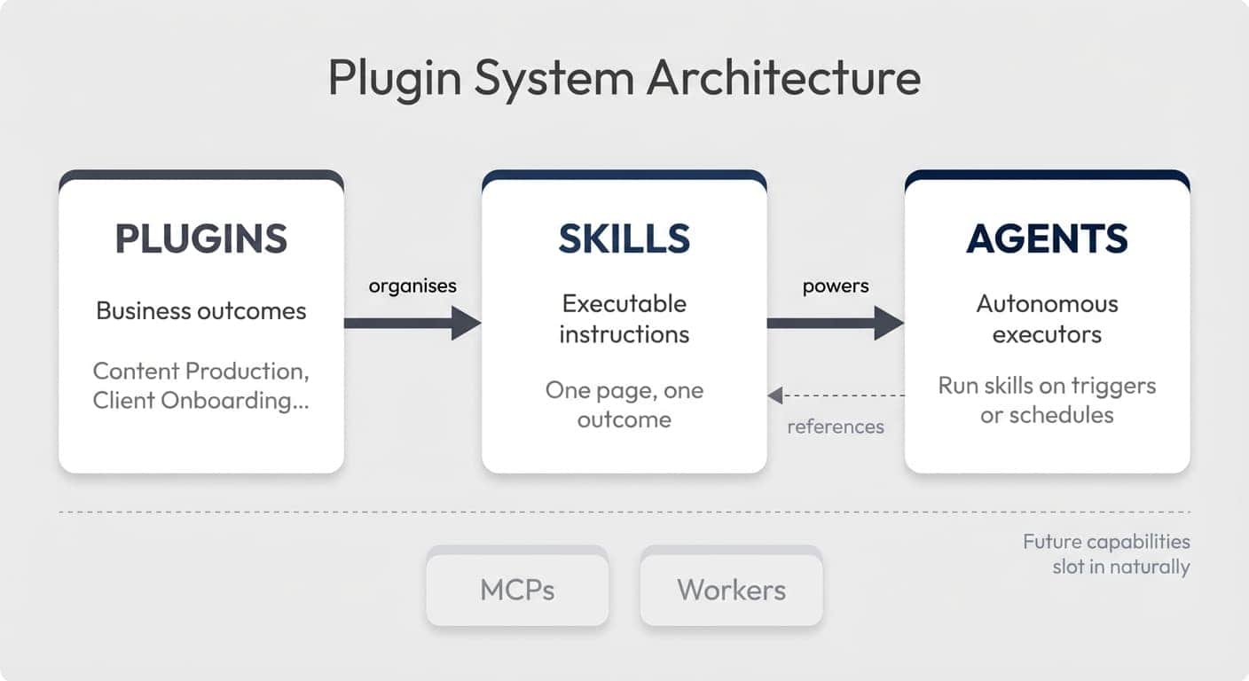 Plugins — the top-level grouping. A plugin represents a larger business outcome, like “Content Production” or “Client Onboarding.” Each plugin has a description (so AI can find it) and links to the skills that power it.